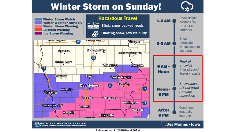 A Winter Weather Advisory goes into effect for Central Iowa at midnight and a Winter Storm Warning begins just south of Des Moines and into southeast Iowa starting at 3 AM on Sunday.