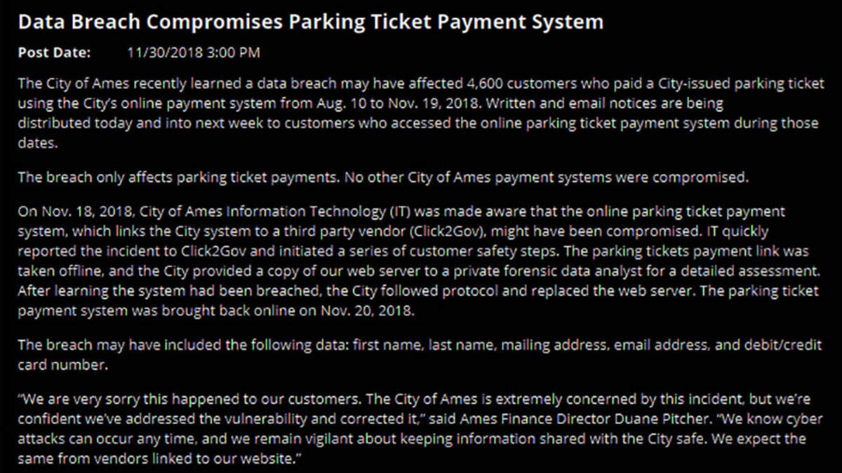 AMES, Iowa - 4,600 people who paid City of Ames parking fines online may have had their financial data stolen by hackers.