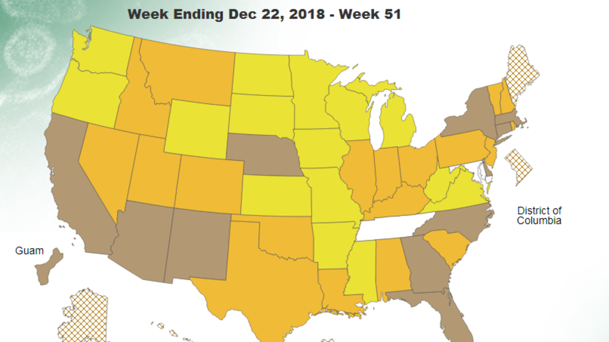 The most recent weekly report from the U.S. Centers for Disease Control (CDC) dated the week ending  December 22 shows an increase in flu cases in Iowa, with localized outbreaks.