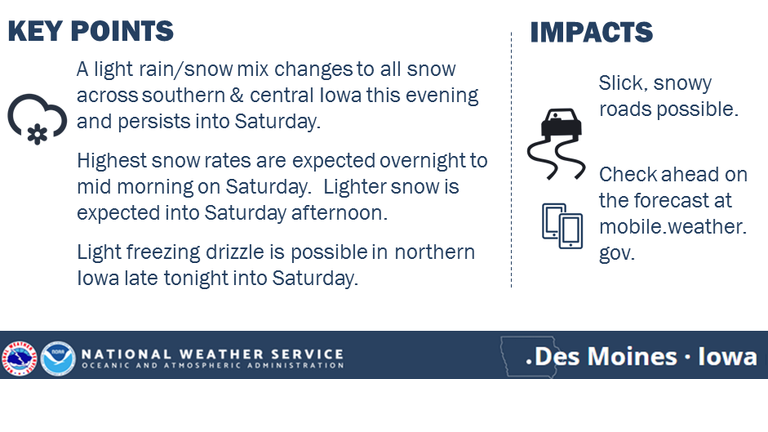 DES MOINES, Iowa - A Winter Weather Advisory is in effect for all of Southern Iowa from about I-80 to the south, and includes the Des Moines, Iowa City, and Davenport metro areas from Friday night into Saturday.
