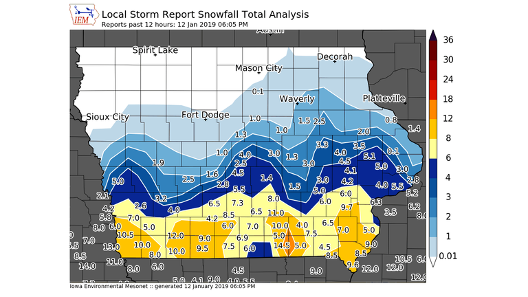 DES MOINES, Iowa - Snow has been piling up across the southern half of Iowa throughout the entire day, Saturday. As snow tapers off and ends this evening, snow totals are coming in.Snowfall totals are compiled by the Iowa State University Mesonet. CLICK HERE for the most recent 12 hour accumulation totals