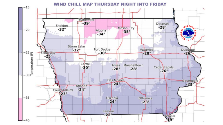 Bitter cold temperatures combined with the strong winds will result in wind chill values ranging from 20 to 35 below zero at times Thursday night into Friday.