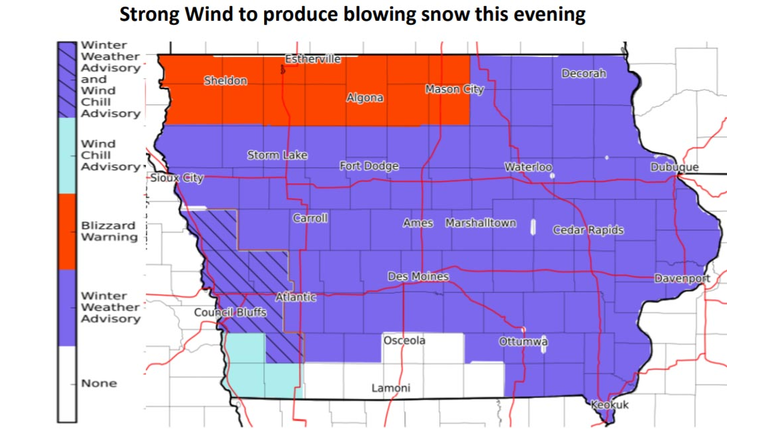 DES MOINES, Iowa - Strong northwest winds will continue to cause significant blowing and drifting snow this evening.
