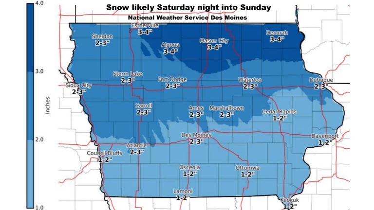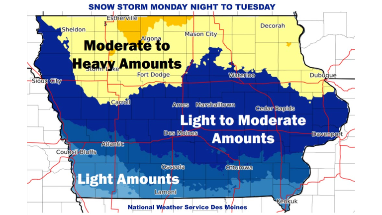 DES MOINES, Iowa - Snow is expected in Iowa Saturday night into Sunday. Another big snow storm is headed into the Midwest, including Iowa, Monday night into Tuesday.