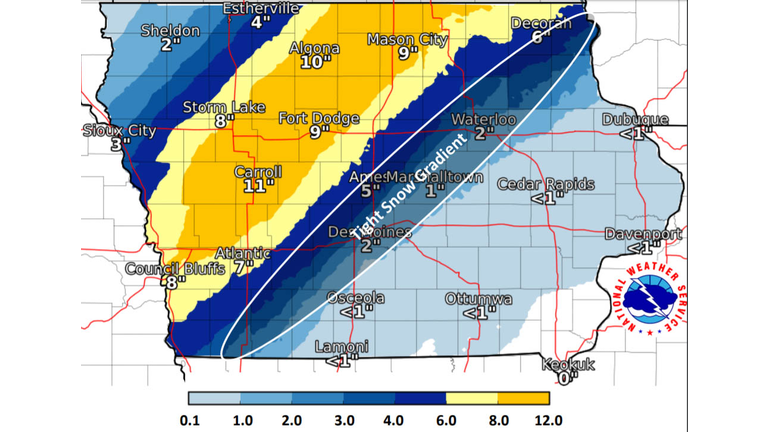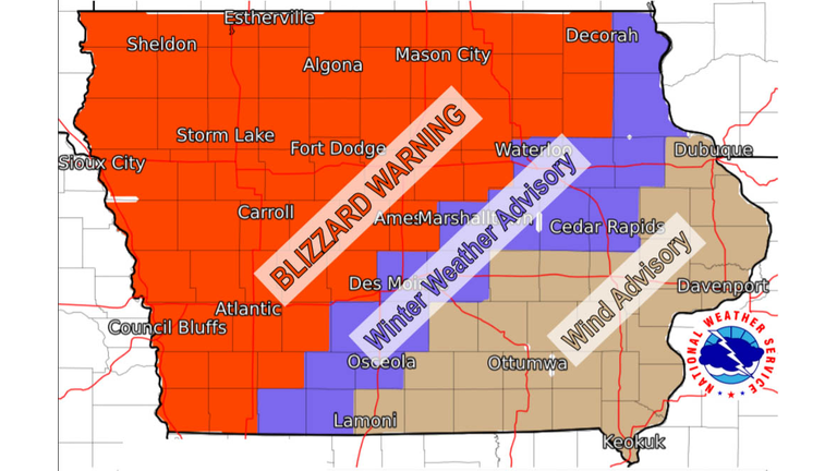 Blizzard conditions are expected with heavy snow from the far southwest corner of the state, to the Northeast corner of Iowa near Decorah. The Blizzard Warning area includes Waukee west of Des Moines to the Iowa/Nebraska border, and Ames north of Des Moines to the Iowa/Minnesota border.