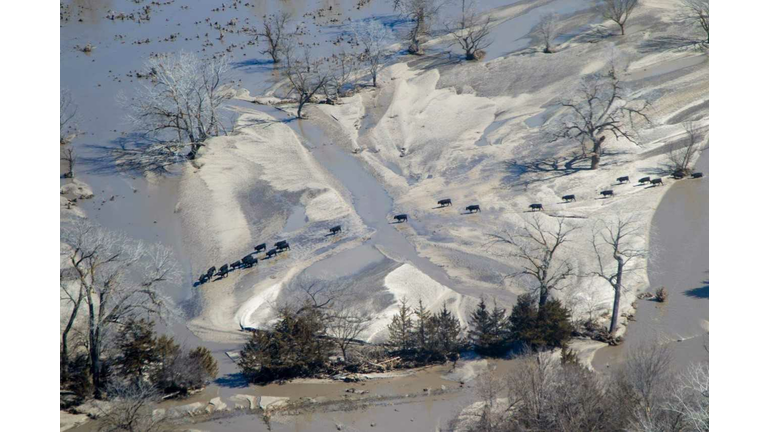 OMAHA, Nebraska - The National guard is dropping massive hay bales to feed cattle stranded after flooding.
