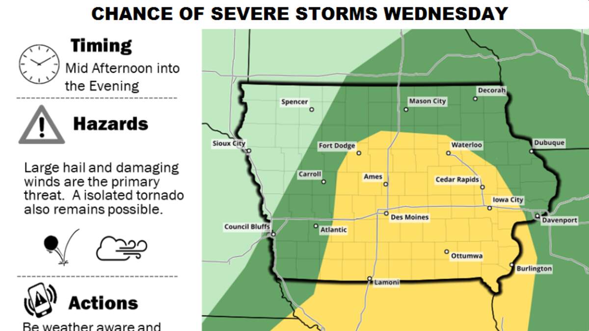DES MOINES, Iowa - The threat of severe weather remains for Wednesday afternoon into the evening in much of Iowa.