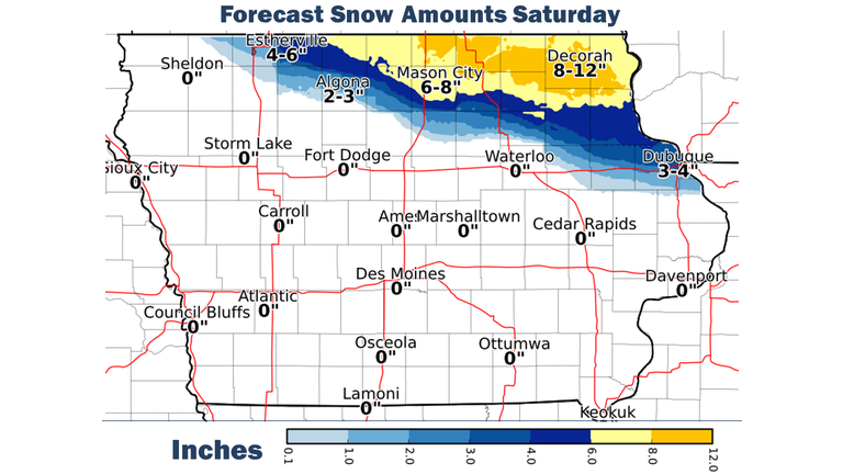 The National Weather Service says a band of 3 to 6 inches is likely with locally higher amounts possible closer to the Minnesota border in northeast Iowa. As much as 7-9 inches is possible in Mason City, near the I-35 corridor in North Central Iowa, and up to 12 inches of snow is possible in Decorah, in the far Northeastern part of the state.