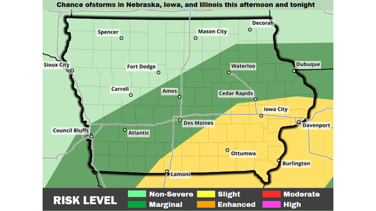 Much of the rest of the region, including the Omaha, Des Moines and Cedar Rapids metro areas are in a lower risk area, but storms are still possible.