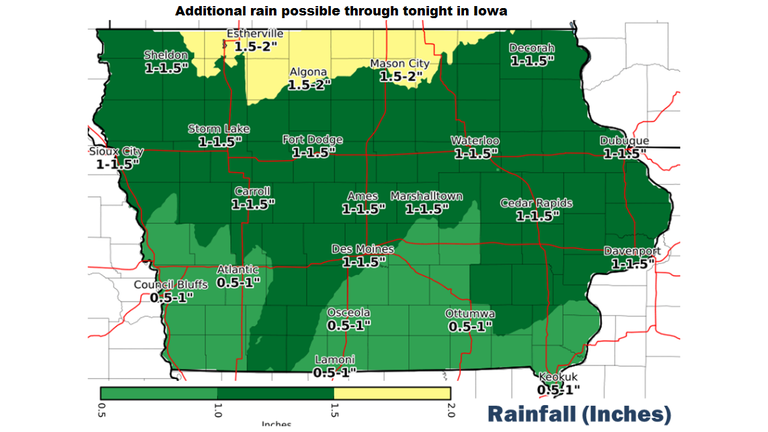 DES MOINES, Iowa - Severe storms are possible this afternoon and tonight across the region stretching from Eastern Nebraska, across Iowa, and into Western Illinois, according to the National Weather Service.