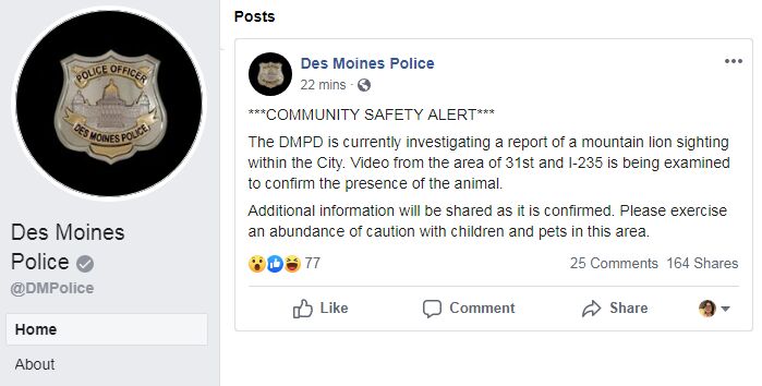 DES MOINES, Iowa - Des Moines police are going through video this morning looking to see if report of a mountain lion sighting near 31st and 235 is a big cat.