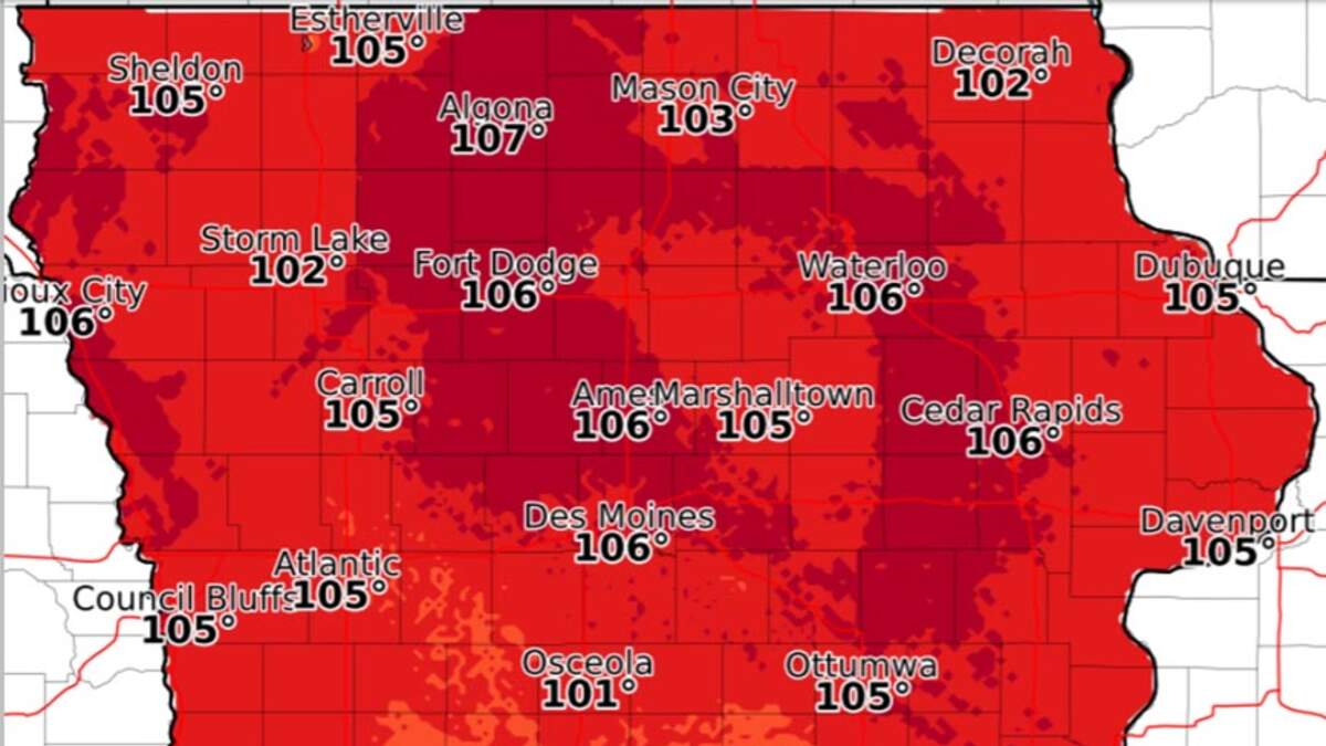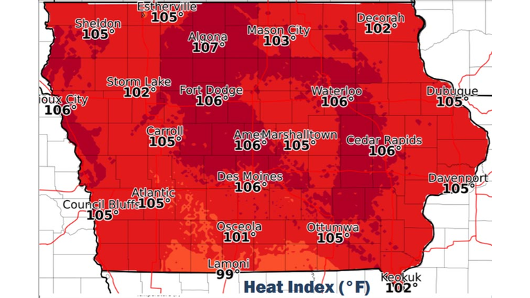Heat index values will approach 105 degrees across much of Western Nebraska, through Iowa, and into Western Illinois, and heat advisories are in effect in much of the area.