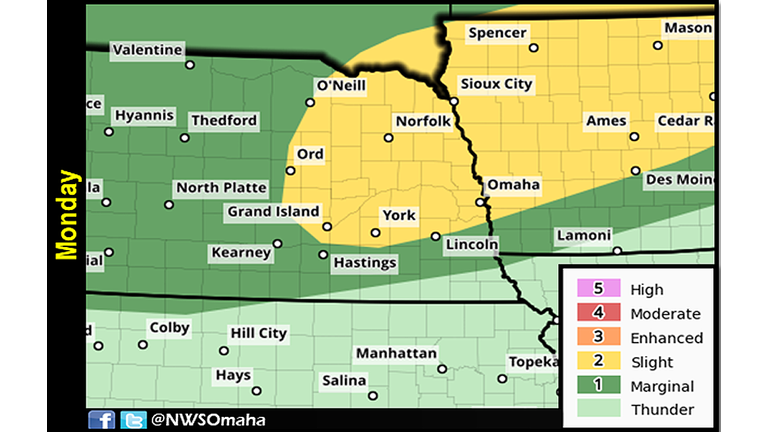 DES MOINES, Iowa - Strong to severe thunderstorms are possible Monday afternoon through the evening hours across the region from Nebraska through Iowa, and on into neighboring states.