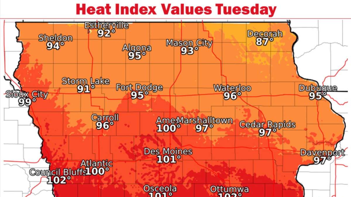 Tuesday looks like the hottest day of the week, with heat indexes in Des Moines and most of southern Iowa in the low 100s.
