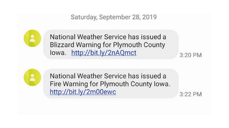 DES MOINES, Iowa - Some people in Iowa are getting Blizzard Warning and Red Flag Fire Warning text messages.