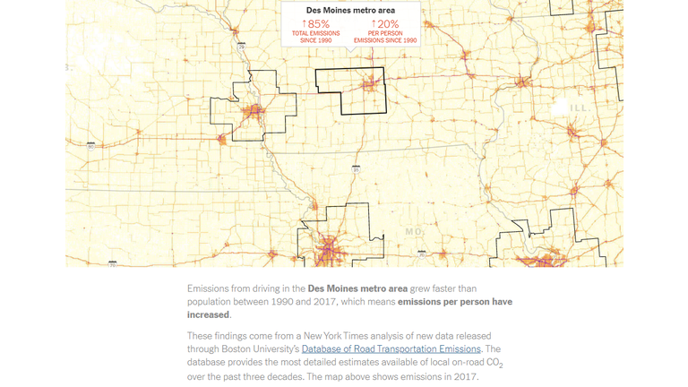 Newly gathered data shows emissions from driving in the Des Moines metro area have grown faster than the population between 1990 and 2017, which reflects an increase in emissions per person.
