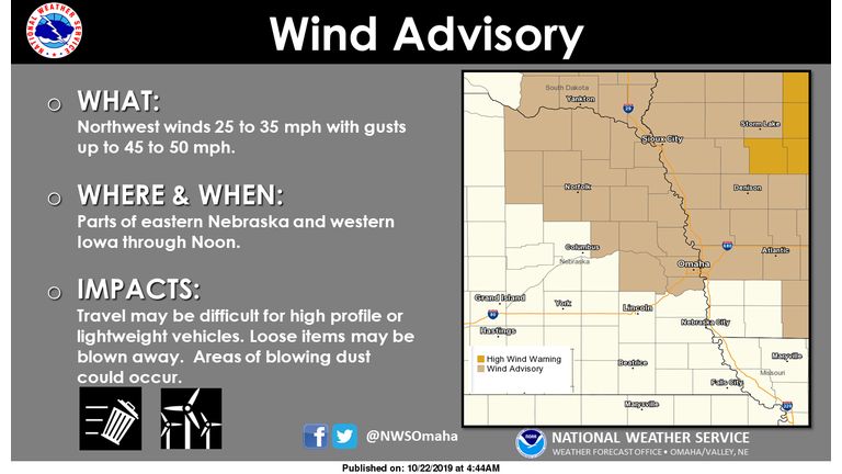 In Eastern Nebraska, from Omaha to the north, and in Western Iowa the Wind Advisory ends at noon, according to the National Weather Service in Omaha.