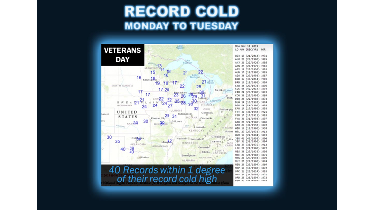 OMAHA, Nebraska - Record cold temperature records will be challenged Monday into Tuesday from Omaha through Des Moines, Ames, Cedar Rapids, Davenport, and then throughout the Northeastern United States.