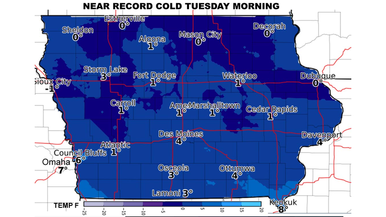 DES MOINES, Iowa - After the snow, comes record cold temperatures across the Nebraska-Iowa-Illinois region. Some areas will come close, and possibly tie cold records on Monday into Tuesday, but several areas are expected to set new cold records.