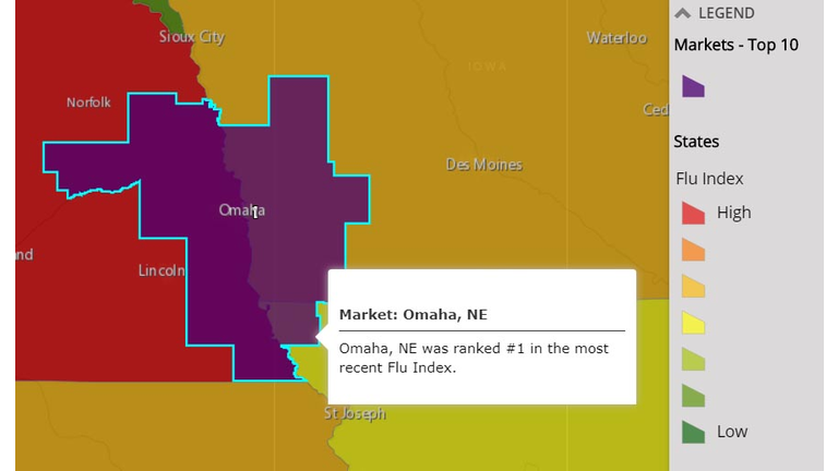 The Walgreens Flu Index ranks Omaha and Nebraska as the top city and state for flu activity based on cases of people being treated with antiviral prescriptions.