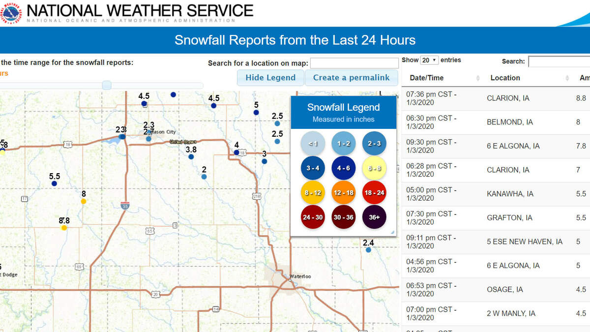 The heaviest snow was reported north of Ames, around Clarion just west of I-35 with 8.8 inches.