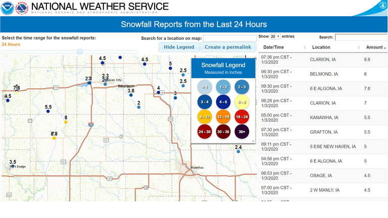 That heavy snow went northward towards the Minnesota border with several other reports around 8 inches, and others more like 2 and a half to 4 inches in northern Iowa... and along northernmost I-35. There were several cars off the interstate during the snow storm and traffic was slowed to about 40 miles an hour for a good hour.