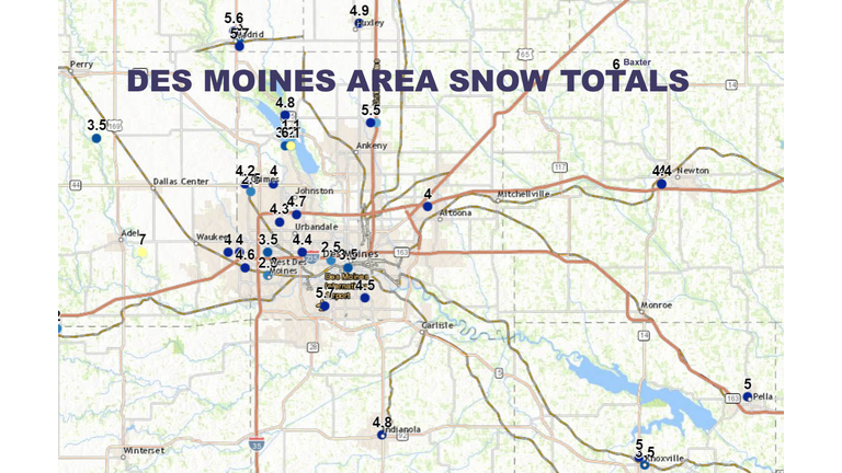 DES MOINES, Iowa - We have plenty of snow.... officially 5.7 inches at the Des Moines Airport with some reports of as much as six and even seven inches in the Central Iowa region. See snow totals map below. We did get the layer of ice, as predicted, generally 1/8 of an inch.