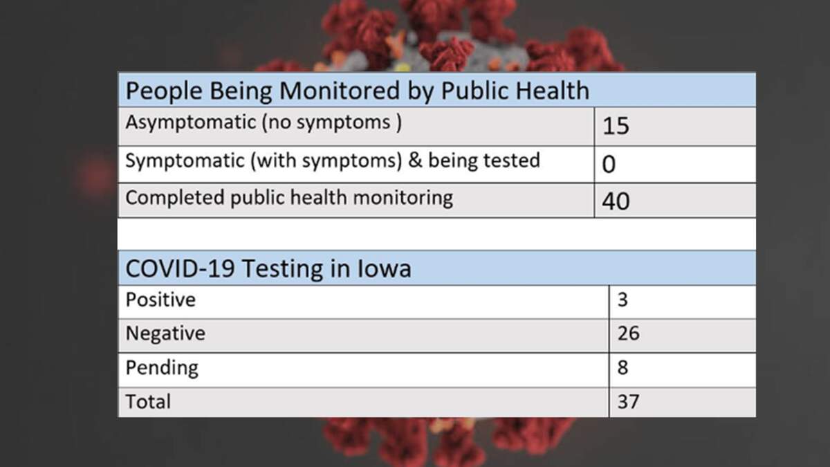 DES MOINES, Iowa - There are now three presumptive cases of coronavirus COVID-19 in Iowa, and 8 more test results are pending.