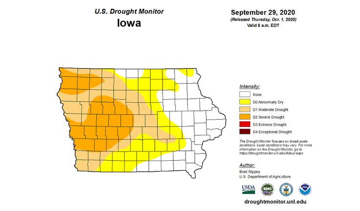This week's National Drought Monitor Map shows just under 70 percent of Iowa with some level of drought--that number was nearly 79 percent last week.