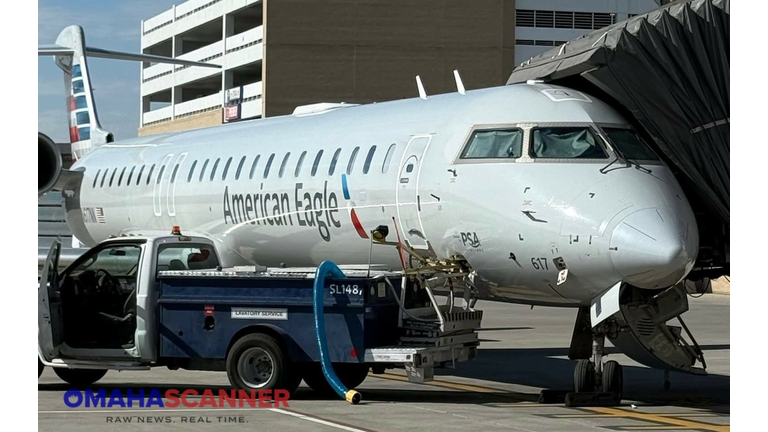 An American Eagle jet has a hole in its side after a sewer waste truck backed into it at Eppley Airfield.
