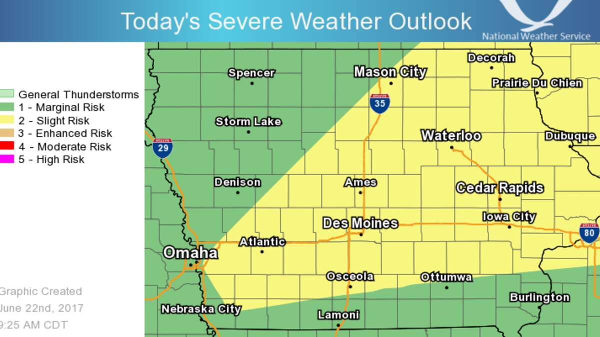 WHO Channel 13 Meteorologists say a cold front will approach during the evening with storms expected in central Iowa after sunset. A couple of these storms could be strong to severe with a slight risk for severe weather currently in place for the central and eastern part of the state.