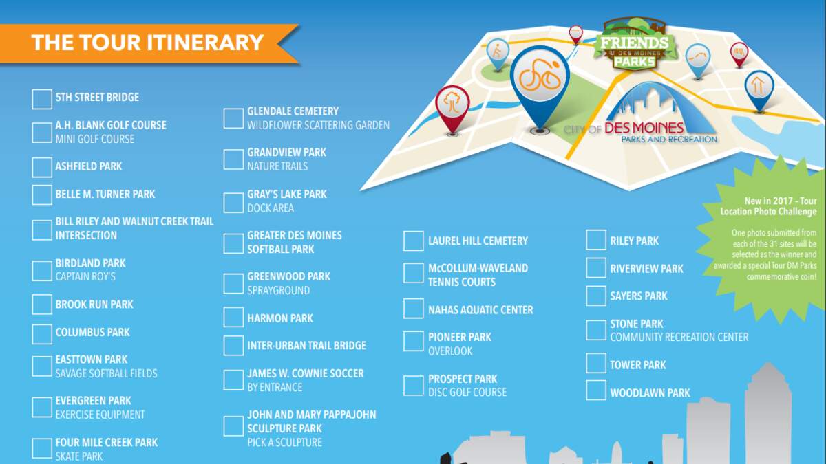 - All who visit 31 locations and submit photos are eligible to compete for the Tour DM Parks grand prize of $1,000.