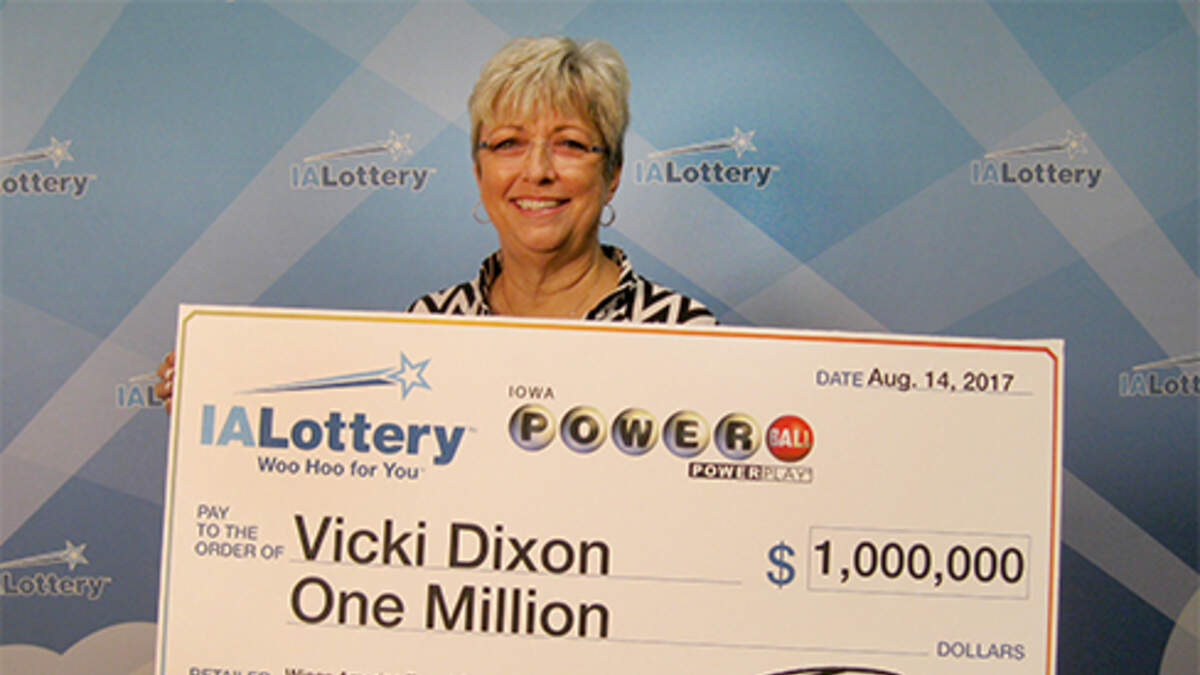A former Iowan who returned to the state last week for her husband's 55-year high school class reunion is going home to Texas the winner of a $1 million Powerball prize.