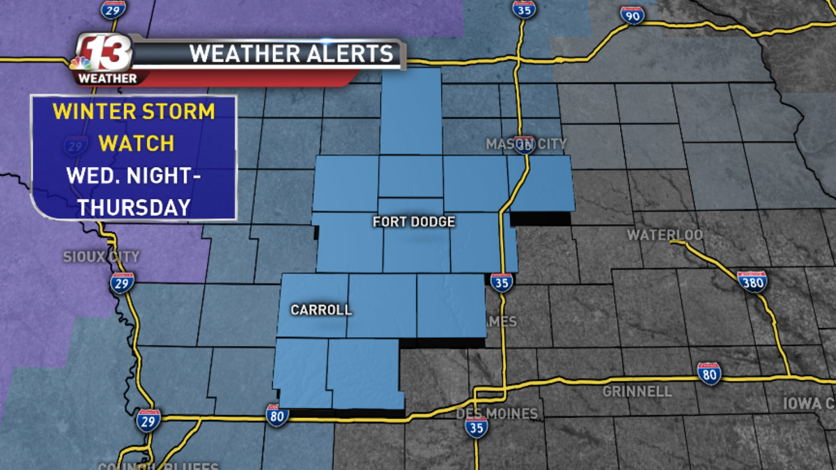 DES MOINES, IOWA - A Winter Storm Watch includes most of Northwest Iowa Wednesday night through Thursday.