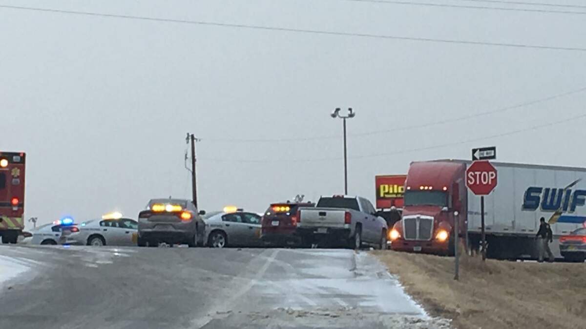 The exit ramp at Atalissa, located east of Iowa City, was blocked by numerous emergency vehicles just before 5:00 p.m.