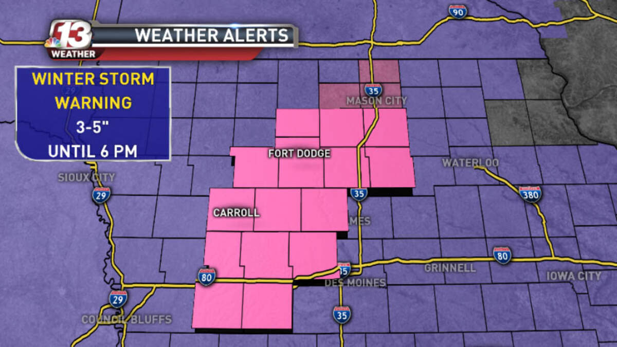 DES MOINES, IOWA - A Winter Storm Warning is in effect for Wright and Franklin counties through Webster, Carroll, Dallas, and Adair counties until 6 PM. 3-6″ of snow is possible and roads are already iced over.