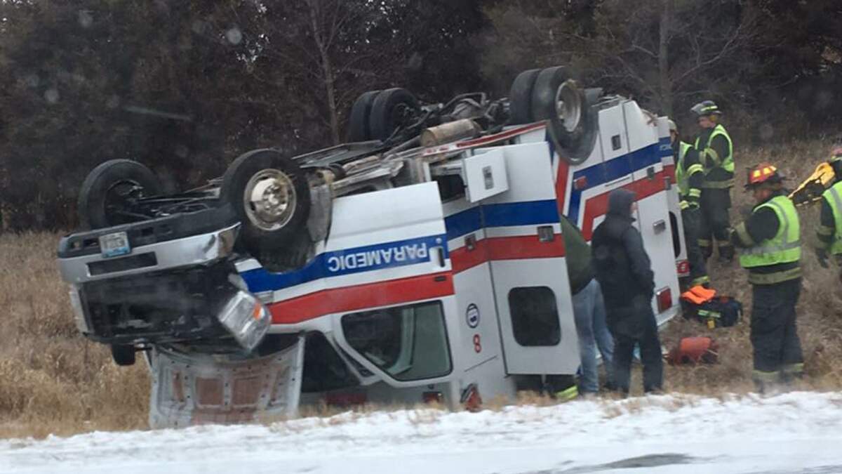 Cell phone video shows the ambulance upside down in a ditch near West Branch, in eastern Iowa Sunday afternoon, reports KCRG-TV Channel 9.