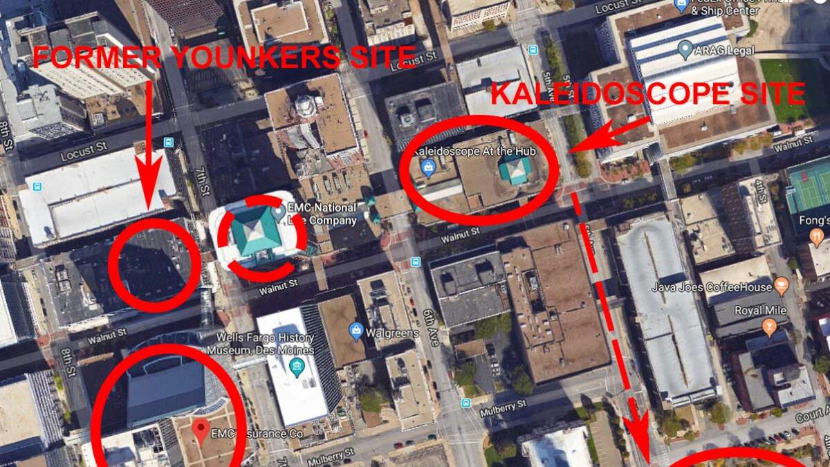 It would be a quick two-block walk from the Kaleidoscope site to Hy-Vee, compared to four blocks from the Younkers site. With other downtown living development, the Kaleidoscope site would make a pedestrian-friendly neighborhood. The Younkers site would put those walking from their apartments to Hy-Vee in a canyon of office high-rises that would be empty most evenings and weekends.