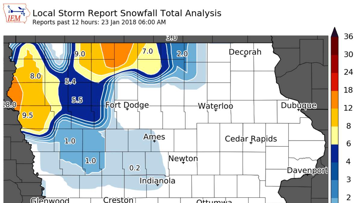 The blizzard that missed the Des Moines area yesterday dumped heavy snow in northwest Iowa. 12 inches of snow was measured near the Estherville area, and 18 inches was reported just north of Sioux City.