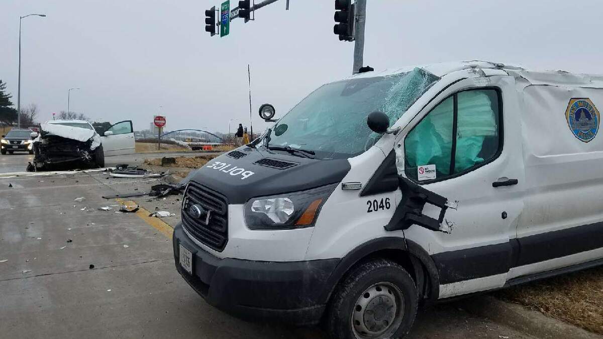 DES MOINES, IOWA - A Des Moines Police van carrying two officers and a prisoner was hit by a car and rolled near I-235 Wednesday.