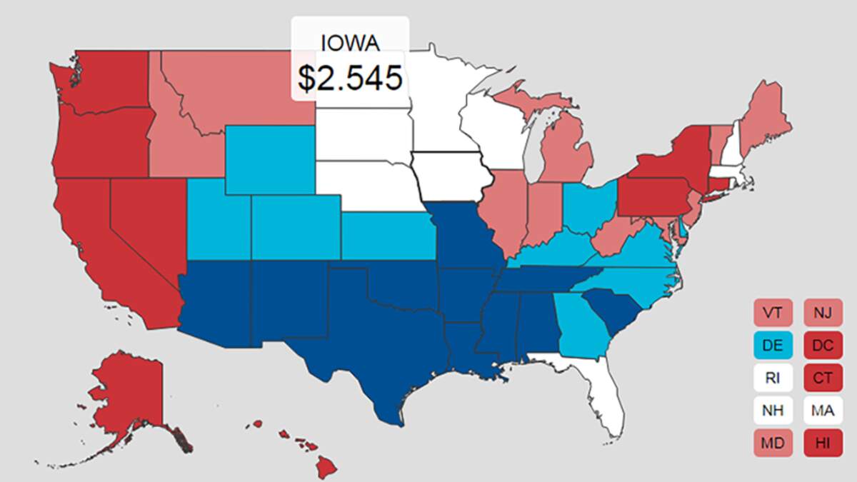 The Iowa statewide average price for regular unleaded is $2.54, a penny lower than the national average.
