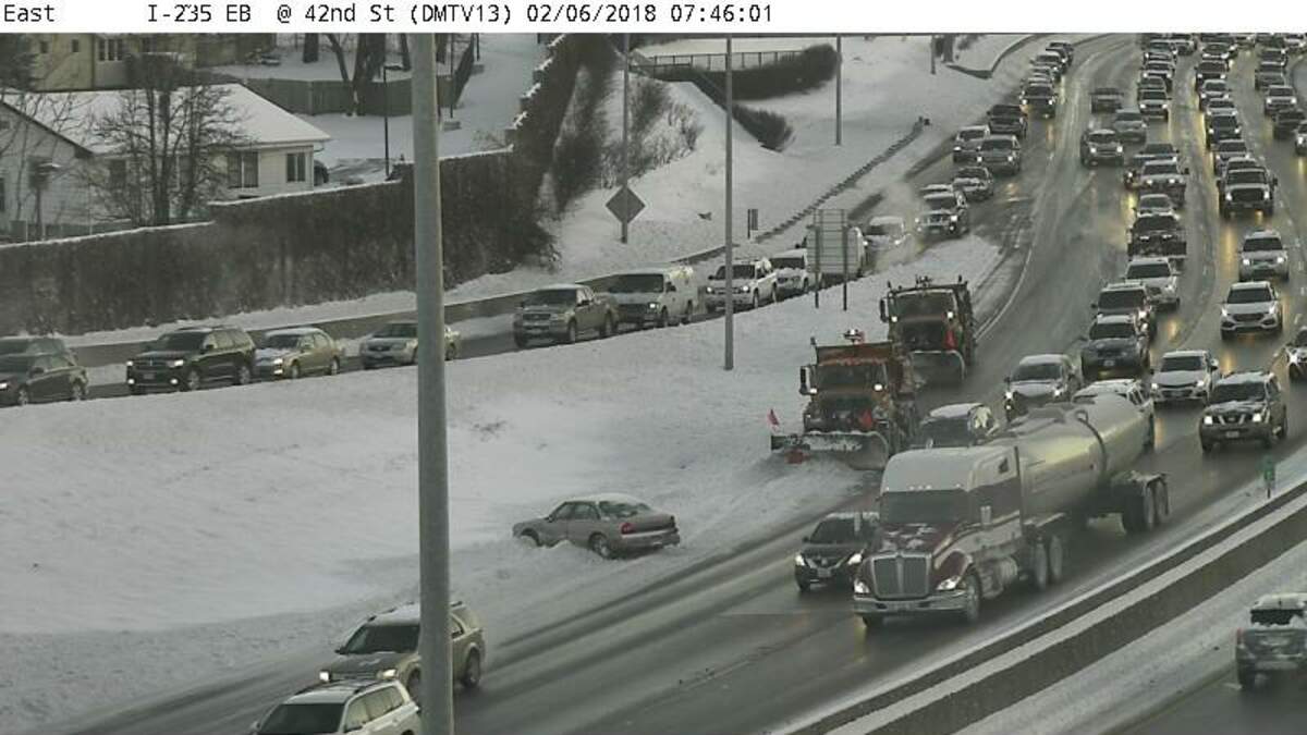 At one point Tuesday morning, traffic was diverted off a stretch of I-235 after a crash blocked the highway. Police dispatch reported ten active crashes at one time near I-235 and Easton. There was report that one car went over a barrier into the oncoming lanes of I-80.