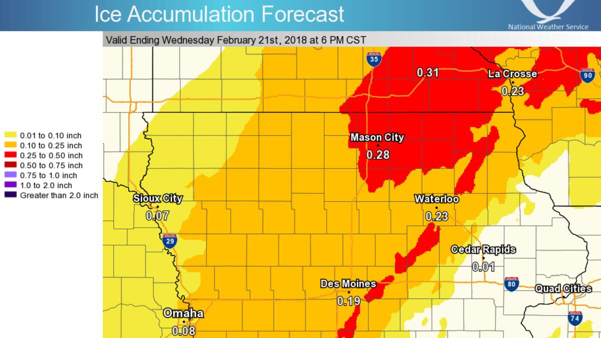 It is starting off warm and wet this morning. WHO Channel 13 meteorologist Jeriann Ritter says we will be in the upper 30s in Central Iowa for a majority of the day. Northern and northwestern Iowa will stay near freezing, so freezing rain is possible in those parts of the state with less than a tenth of an inch of ice there. Liquid rain will continue to fall early Monday morning in Central and Southern Iowa and temperatures will be in the 40s.