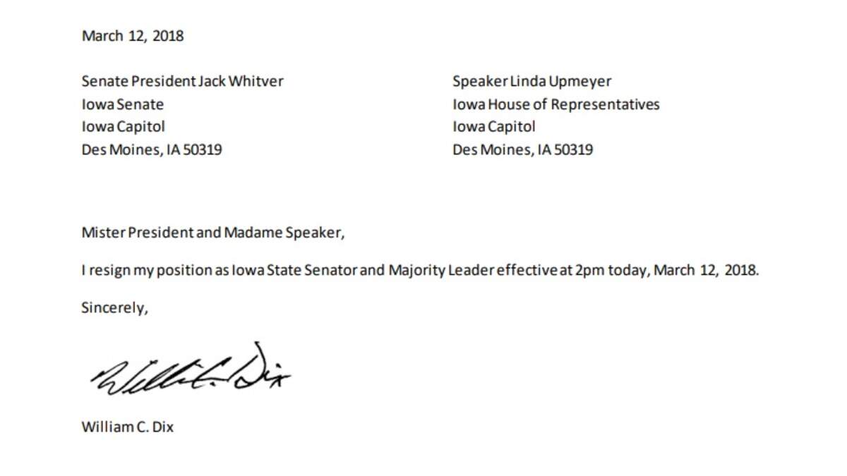 The Shell Rock Republican's resignation letter was sent to Iowa Senate President Jack Whitver and Speaker of the Iowa House, Linda Upmeyer.