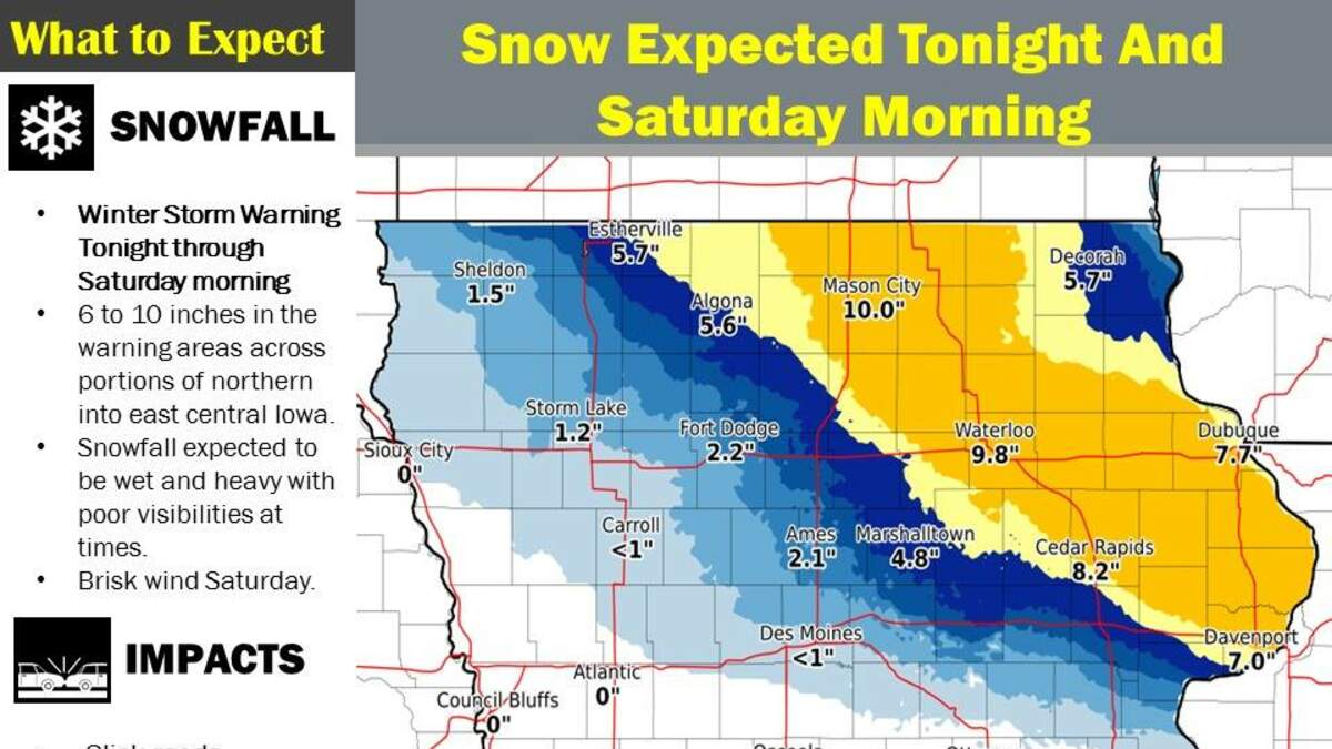DES MOINES, Iowa - A Winter Storm Warning is out for parts of eastern Iowa Saturday with up to 10 inches of snow expected. In the Des Moines area, heavy rain is likely tonight, with some snow possible Saturday.