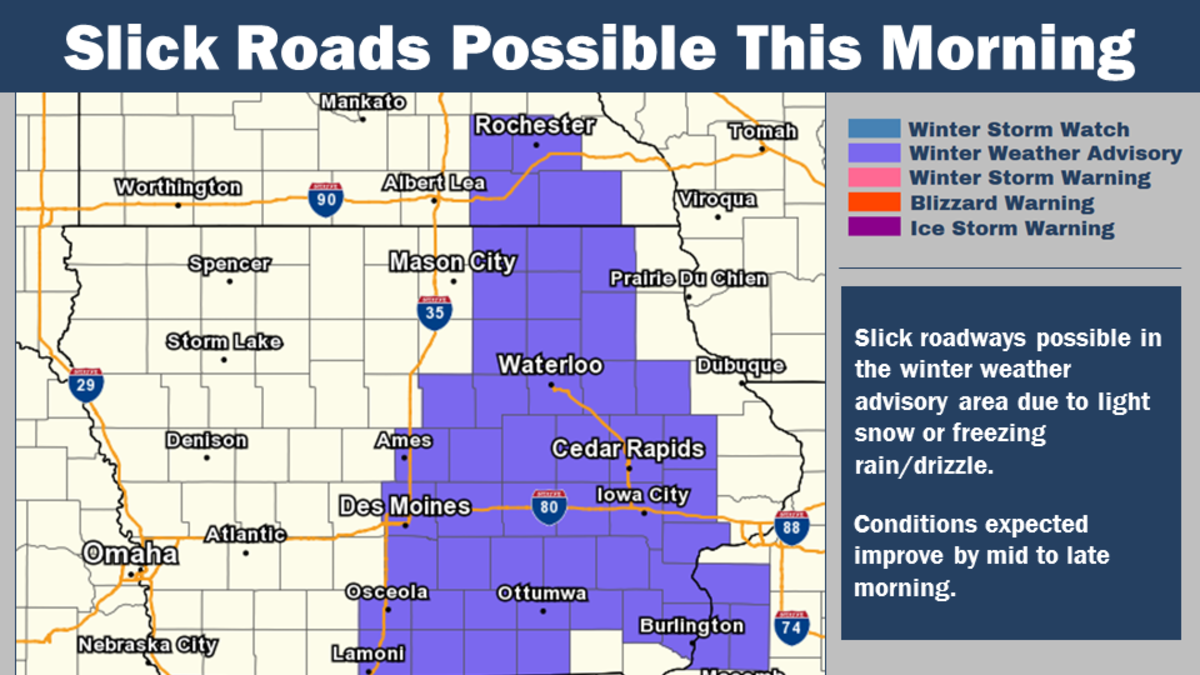 DES MOINES, Iowa - Icy roads are possible across central and parts of eastern Iowa this morning.