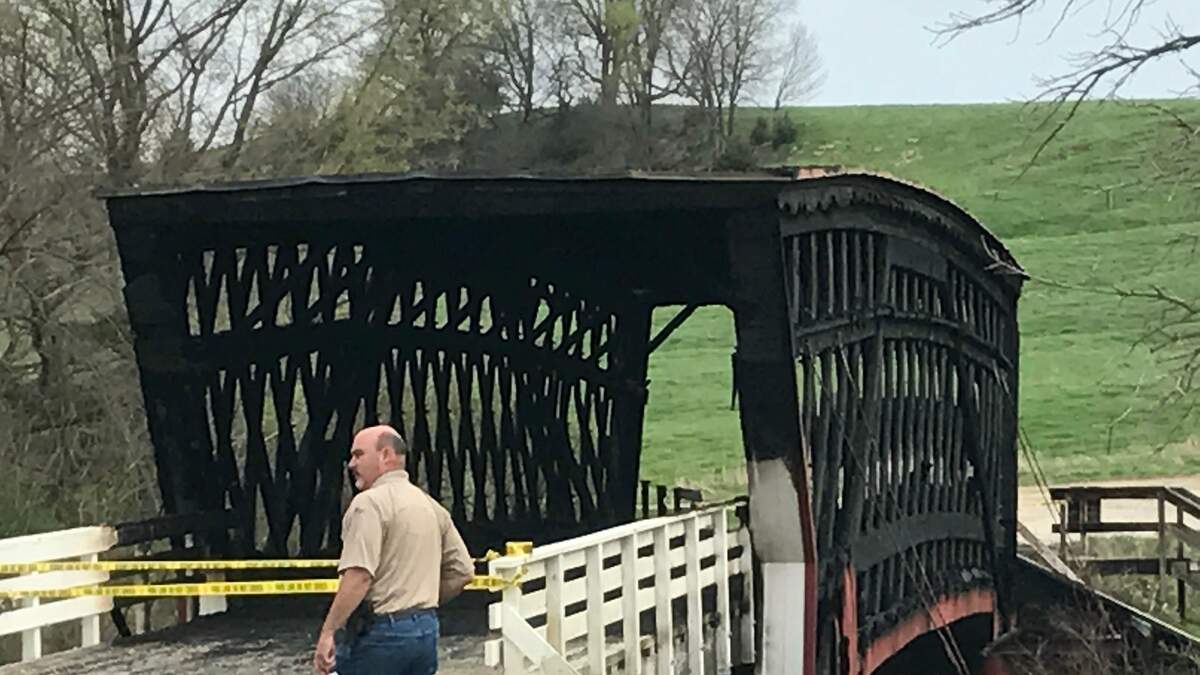 Historic Cedar Bridge in Madison County destroyed by arson.  Photo WHO TV