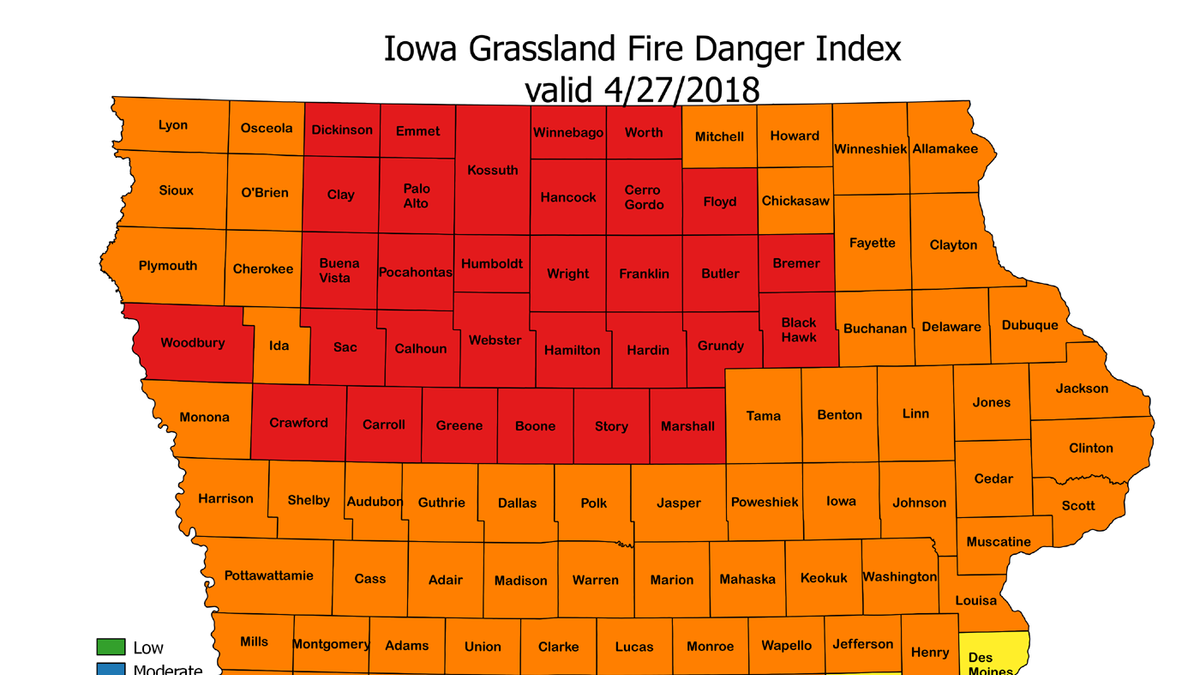 UPDATE: The National Weather Service in Des Moines reports the fire risk in Iowa for Saturday, April 29th has diminished considerably, thanks to lighter winds and cooler temperatures.