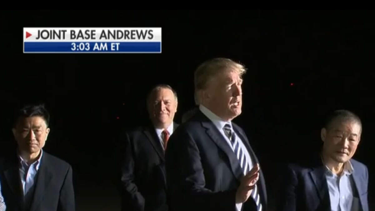 ANDREWS AIR FORCE BASE - When three Americans newly freed from detention in North Korea arrived at Andrews Air Force Base in Maryland early Thursday, President Donald Trump was there to greet them.