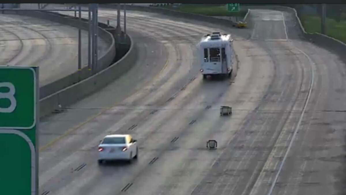 In this new video, vehicles are seen dodging and finally hitting lawn chairs that fell onto I-235 in Des Moines.